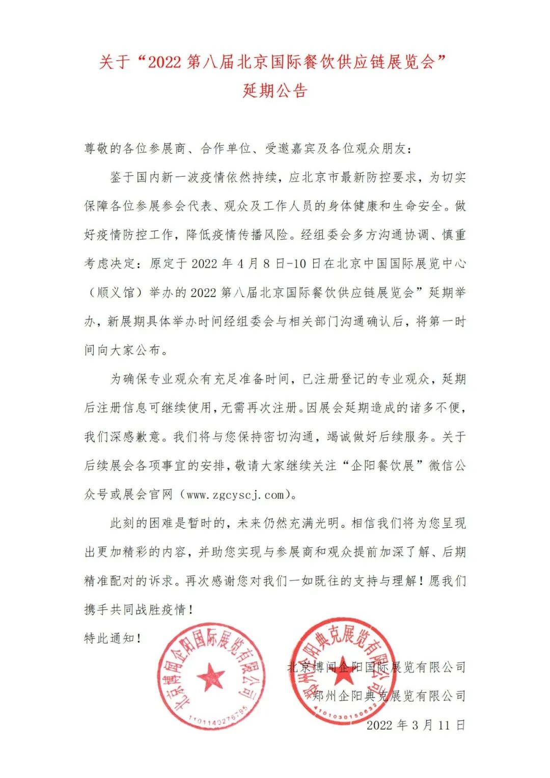 关于“2022第八届北京国际餐饮供应链展览会”延期公告