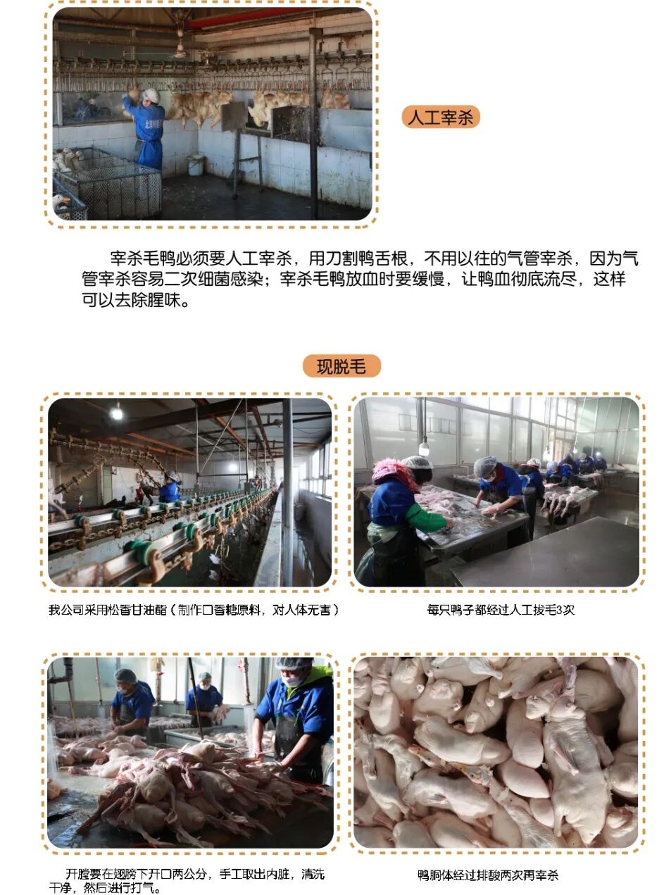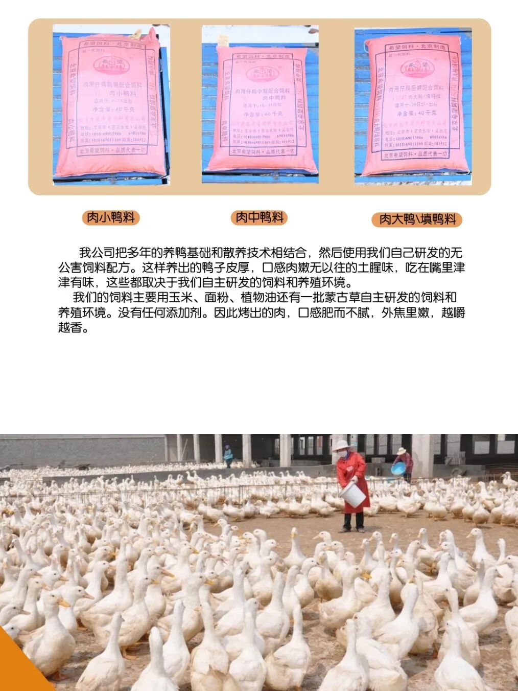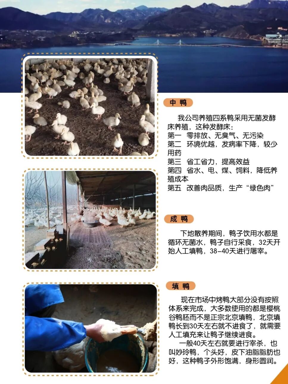 北京雁栖福帮养殖有限公司位于北京市怀柔区雁栖镇雁栖湖南岸,有着二十多年的人工填鸭7天及散养北京四系填鸭技术。我公司选用最正宗的四系鸭苗,这是经过北京鸭四次驯化后选种得名四系鸭,饲料是我公司请农科院多次改良研发合成,并且饲料中添加了一种草原的天然香草,因此我公司生产出的鸭胚肉质、口感都非常独特。