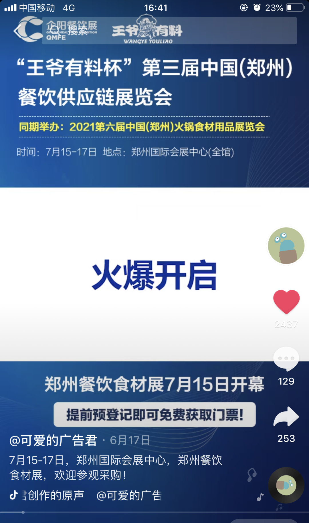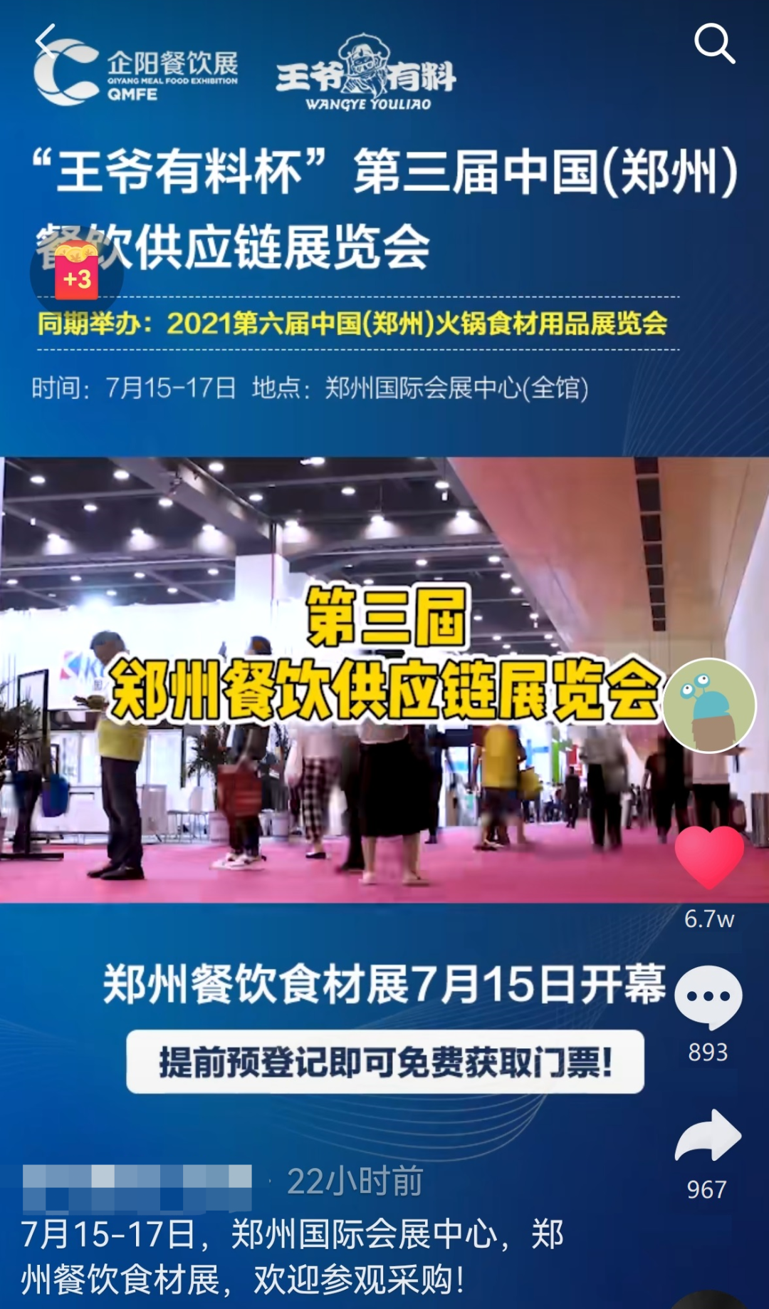 本届郑州餐饮展在抖音面对餐饮相关从业者人群,有针对性的持续投放展会信息广告。
