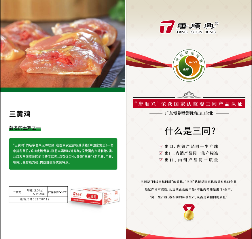 惠州顺兴食品有限公司座落于素有“岭南第一山”之称的罗浮山下,是一家集家禽养殖、加工,销售于一体的中外合资企业,公司创建于1990年,在社会各界的鼎力支持下,经过全体员工的艰苦奋斗,公司不断壮大,目前公司员工近1,000人,其中高级管理人员130多人,专业技术人才100多人。公司产品主要有「唐顺兴」牌系列禽肉食品,销售网络覆盖香港、澳门、北京、上海、广州、深圳、东莞等地,年生产总值达13亿元人民币,年创汇额5,328万美元,是一家具强劲出口创汇能力和竞争实力的现代化农业龙头企业。