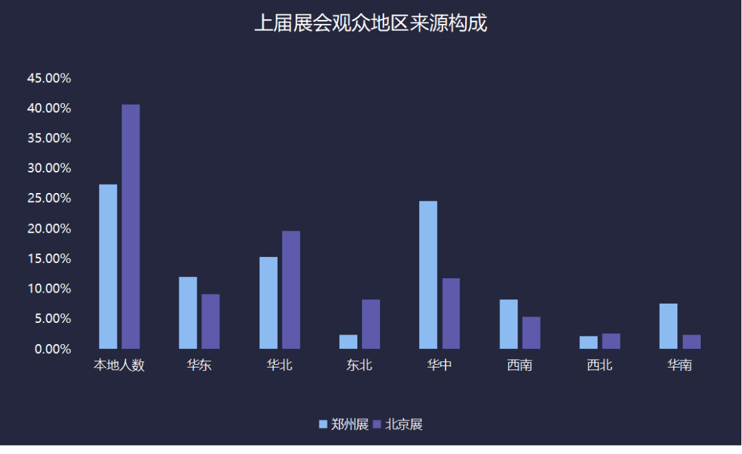 (本地人数数据与当地城市所在地区人数互不重叠,单列一组。如郑州展中,本地人数+华中地区人数=华中地区整体人数数据)