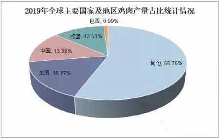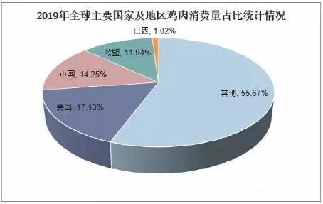 2019年,我国鸡肉产量1375万吨,位列全球第二,占全球鸡肉产量比重13.81%;鸡肉消费量1390万吨,占全球鸡肉消费量比重14.26%。
