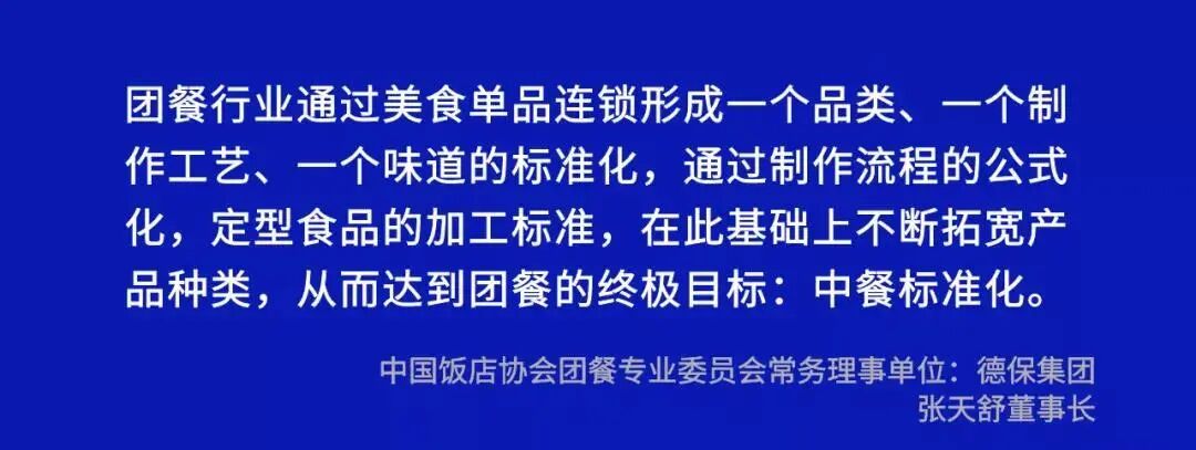 美食单品连锁就是中餐标准化的突破口,团餐行业通过美食单品连锁形成一个品类、一个制作工艺、一个味道的标准化,通过制作流程的公式化,定型食品的加工标准,在此基础上不断拓宽产品种类,从而达到团餐的终极目标:中餐标准化。