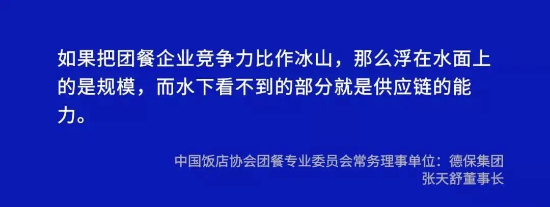 如果把团餐企业竞争力比作冰山,那么浮在水面上的是规模,而水下看不到的部分就是供应链的能力,团餐行业的特点,规模化菜品容易统一,竞争到最后注定就是供应链整体运营能力的角逐。