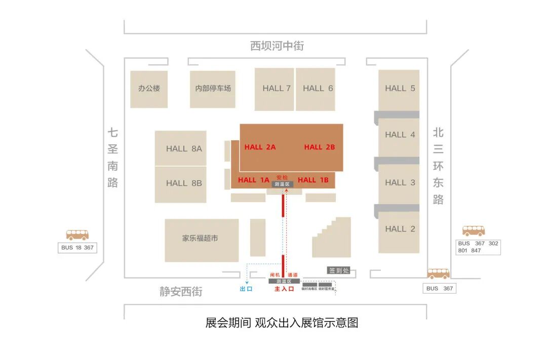 展览中心(静安庄馆)1号门为展会入口处,进入展馆前需接受安全防疫检查,出示绿色“健康码”“行程码”,刷参观证件通过闸机进入展馆。