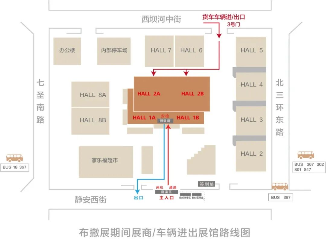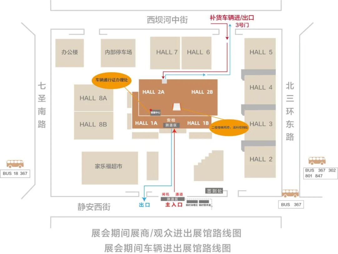 从展馆(静安庄馆)3号门驶入——经1号馆西门进入展馆。