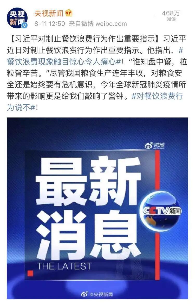 另据彭博新闻社网站8月11日报道,中国国家主席习近平呼吁立即采取措施,制止餐饮浪费行为,特别是在全国抗击新冠疫情之际。