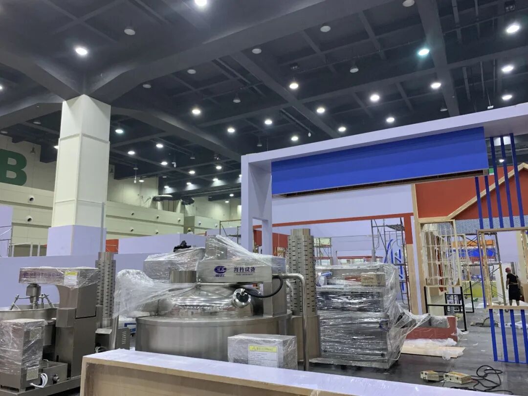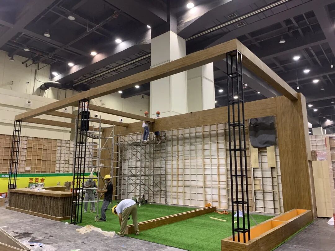 经过一天紧锣密鼓的搭建,很多展位已初见雏形。