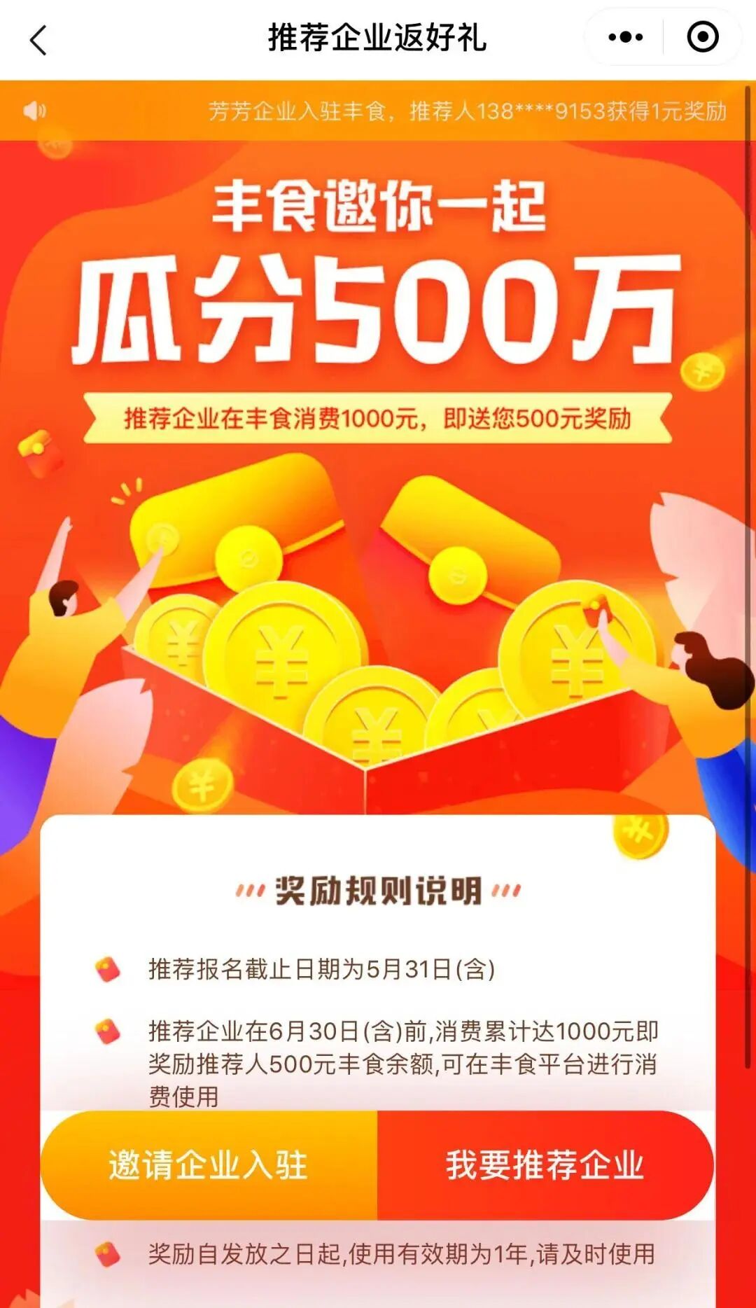 另外,在“瓜分500万”活动中,用户可通过“邀请企业入驻”和“我要推荐企业”页面推荐企业。奖励金额也十分可观,企业成功入驻后,推荐人将获取1元奖励。而推荐的企业6月30日前在丰食消费1000元,推荐人还可另外获得500元奖励。