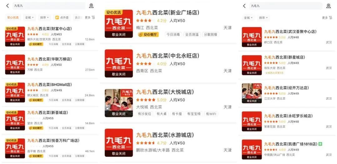 大众点评显示,九毛九西北菜北京6家门店,天津6家门店,武汉10家门店已歇业,暂停收录。