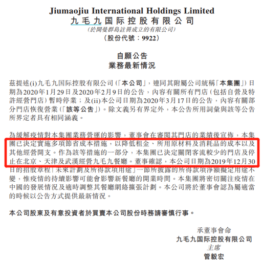 作为该等措施的一部分,集团已决定关闭客流较少的门店,并停止在北京、天津及武汉经营九毛九餐厅。