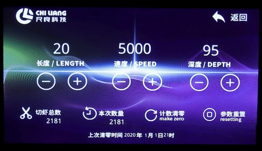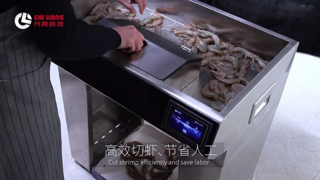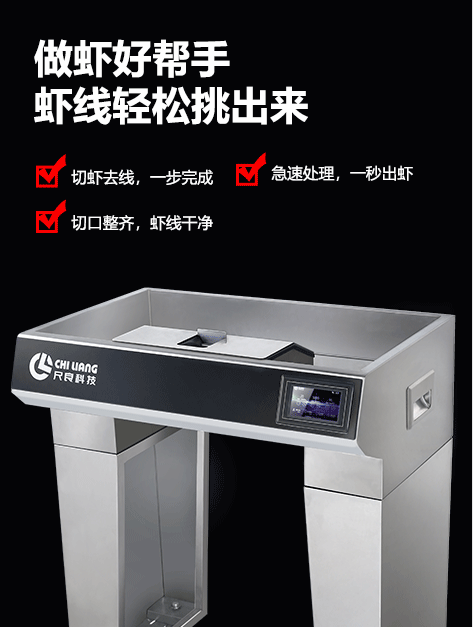 采用自主研发的符合人体工程学设计的进虾滑槽,高灵敏控制系统和触屏操作,可以根据切虾要求在毫米级范围内调整切虾的长度和深度,同时具有切虾数量自动记录和显示功能。