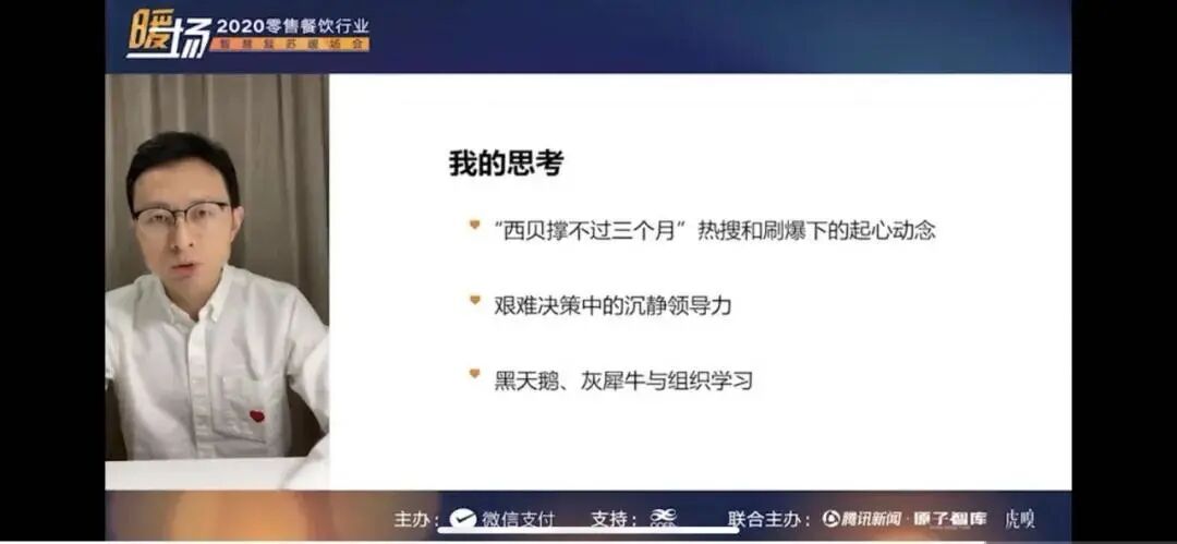 4月9日晚,由微信支付主办,中国连锁经营协会支持,腾讯新闻原子智库、虎嗅共同打造的"2020年零售餐饮行业复苏暖场会",邀请到了腾讯公司微信副总裁耿志军、梅花创投创始合伙人吴世春、中国连锁经营协会常务副秘书长王洪涛等,深度解读未来三个季度的商业趋势与行业机遇。