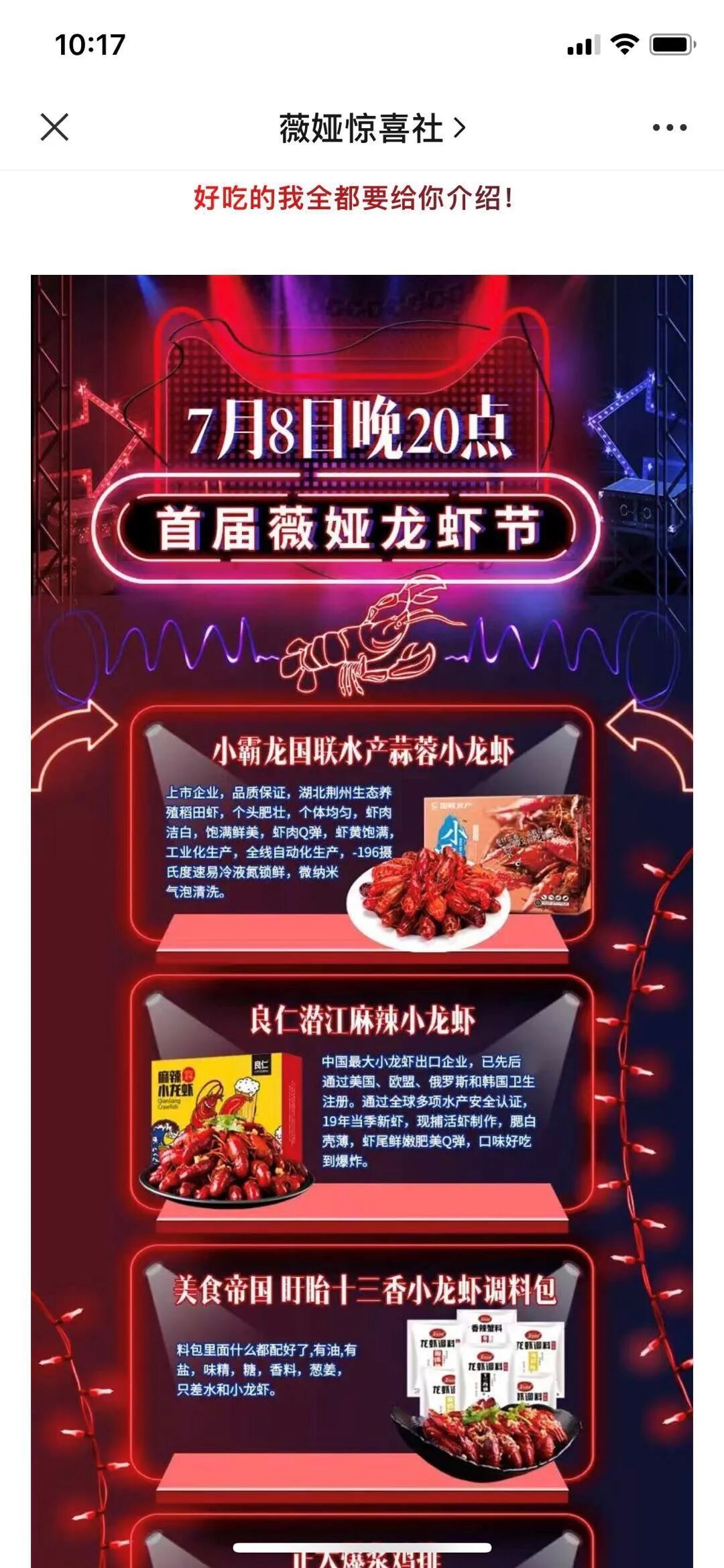 平均每场直播观看人数近2000万人次的顶级主播薇娅,去年就办了一个龙虾节,各种电商小龙虾上线三秒就抢不到了,数十万盒小龙虾直接售罄!