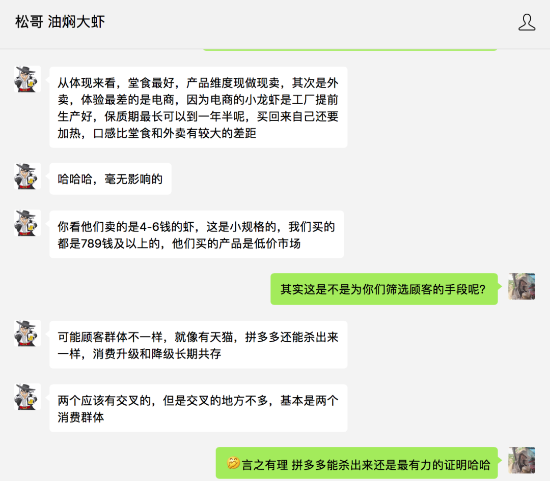 (松哥油焖大虾松哥和记者的聊天记录,从虾的规格、新鲜度以及客群方面都做出了区分,两者几乎不会抢生意。)