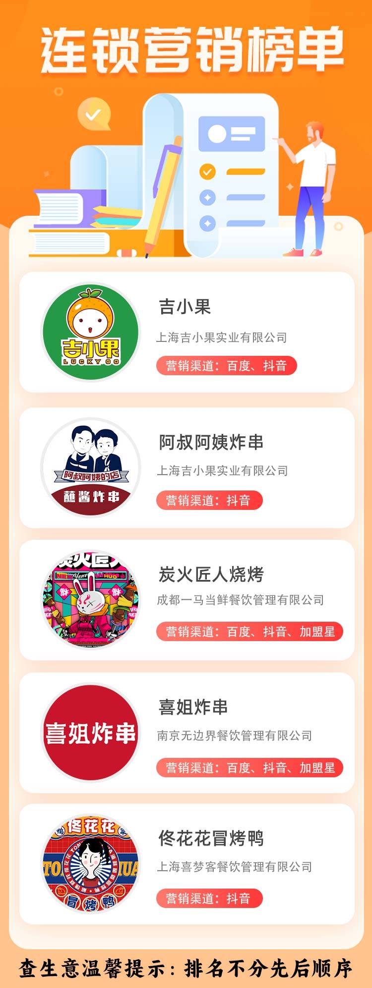 在当今数字化营销浪潮中,连锁品牌通过多元化的营销渠道,不断拓宽市场,增强品牌影响力。本次为大家带来连锁营销榜单上的五大品牌介绍,它们分别是吉小果、阿叔阿姨炸串、炭火匠人烧烤、喜姐炸串和佟花花冒烤鸭。这些品牌通过巧妙的营销策略,成功吸引了众多消费者的目光。