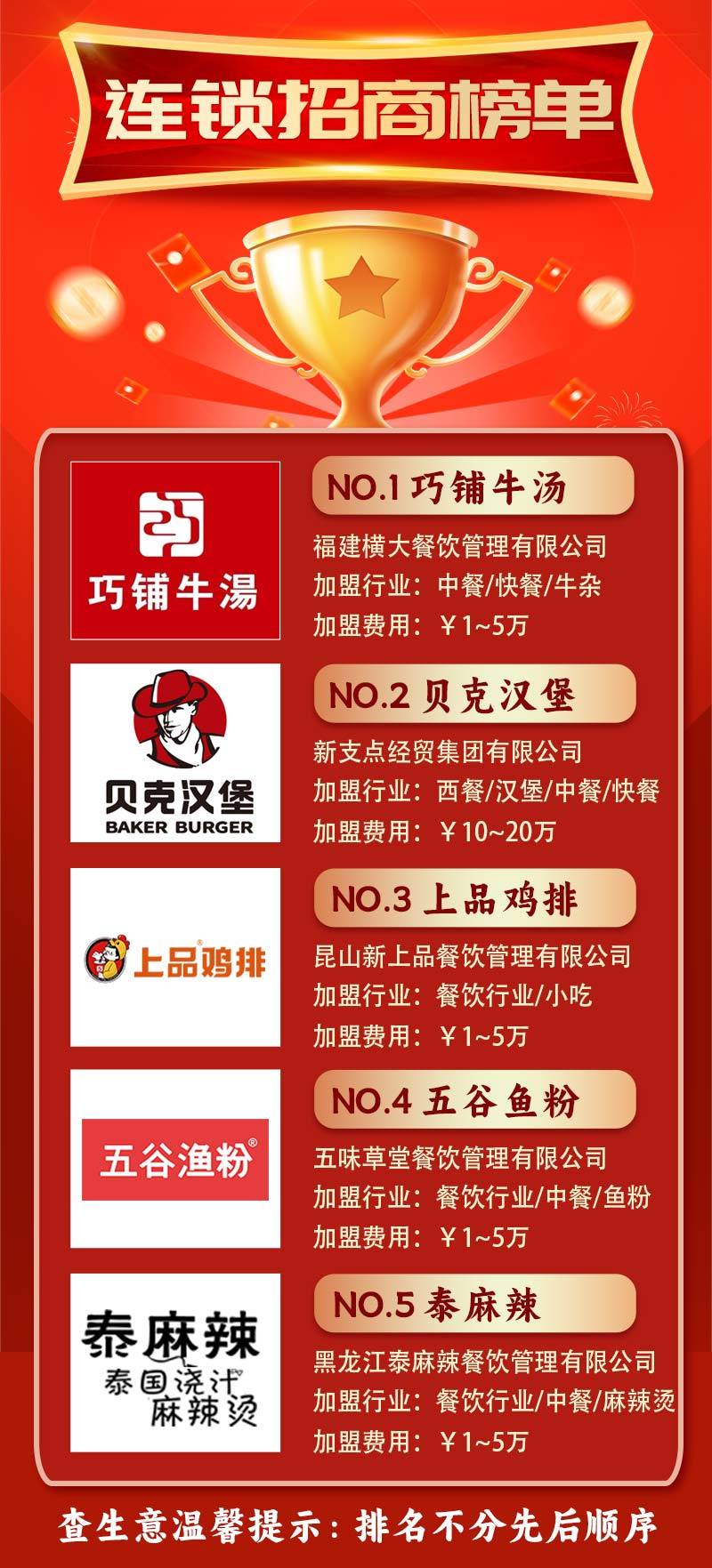 近年来,餐饮行业迎来了新一轮的连锁招商热潮,众多品牌纷纷崭露头角,以各自独特的魅力吸引着众多创业者的目光。在最新公布的连锁招商榜单中,巧铺牛汤、贝克汉堡、上品鸡排、五谷鱼粉和泰麻辣五大品牌名列前茅,它们不仅各具特色,更展现了餐饮行业的无限可能。