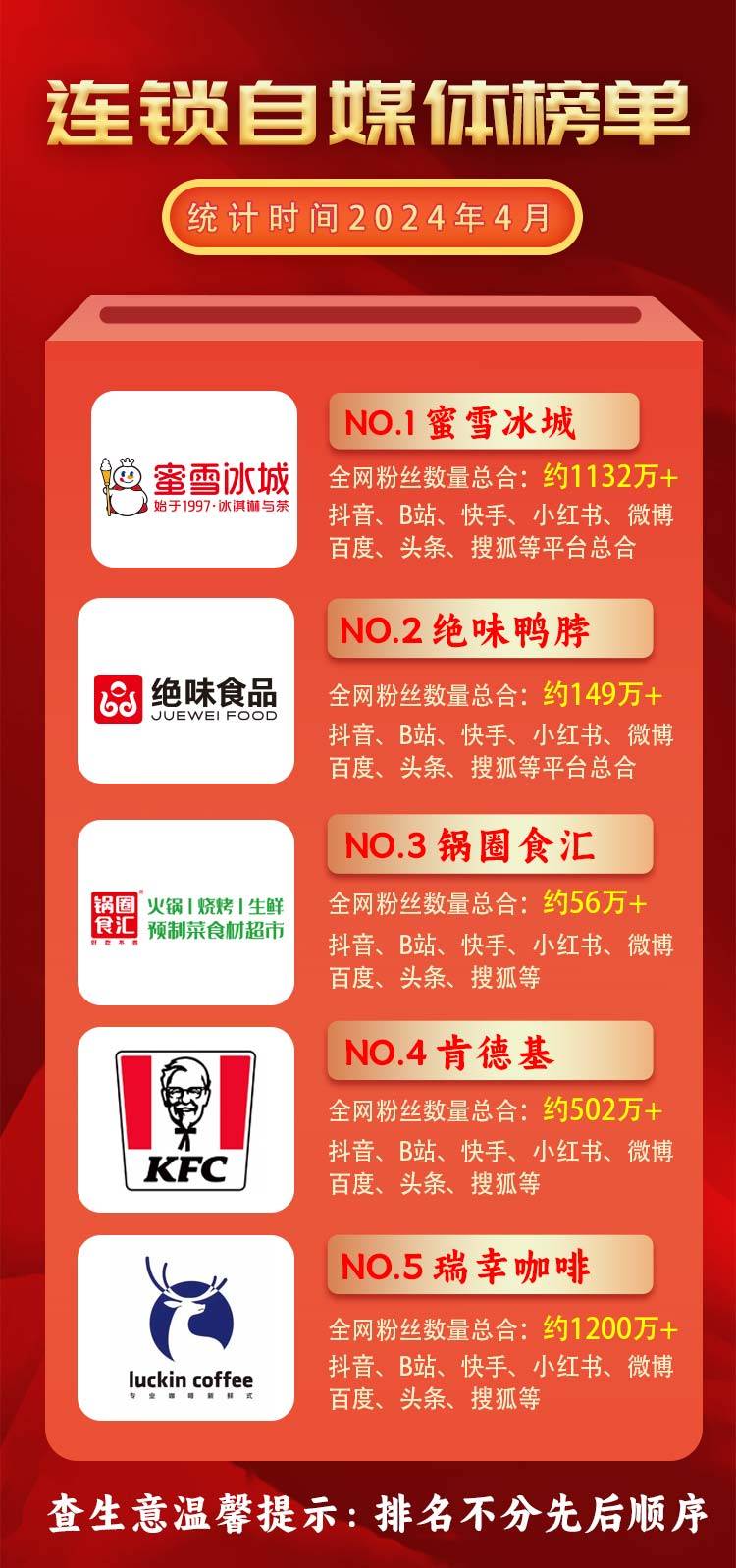 位居榜首的是蜜雪冰城,该品牌以其鲜明的品牌形象和独特的产品魅力,在各大自媒体平台上积累了庞大的粉丝群体。无论是在抖音、B站还是小红书等社交平台,蜜雪冰城都以其精致的内容创作和互动营销策略,吸引了大量年轻消费者的关注和喜爱。