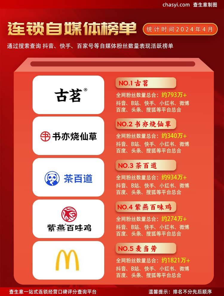 在2024年4月最新公布的连锁自媒体榜单中,古茗、书亦烧仙草、茶百道、紫燕百味鸡和麦当劳这五大品牌脱颖而出,凭借其强大的粉丝基础和活跃的自媒体表现,成为了行业内的佼佼者。