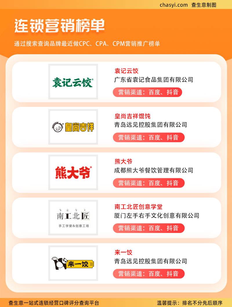 在当今数字化营销的时代,连锁品牌通过有效的营销推广,能够快速积累品牌影响力,赢得市场份额。最近,连锁营销榜单中涌现出五大耀眼之星:袁记云饺、皇尚吉祥馄饨、熊大爷、南工北匠创意学堂以及来一饺。这些品牌不仅在各自的领域里取得了骄人的成绩,更在百度和抖音两大平台上,通过CPC、CPA、CPM等多种营销推广方式,实现了品牌价值的最大化。