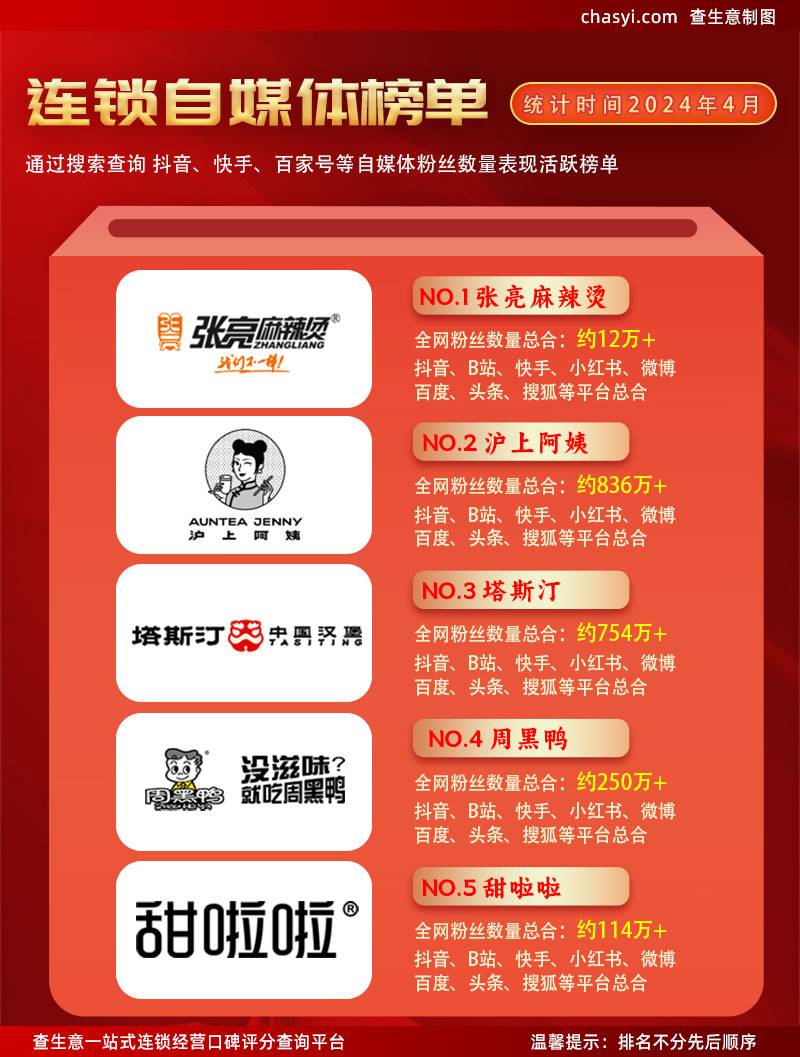随着互联网的快速发展,自媒体已成为品牌传播与营销的重要阵地。近日,一份统计时间为2024年4月的连锁自媒体榜单火热出炉,张亮麻辣烫、沪上阿姨、塔斯汀、周黑鸭和甜啦啦五大品牌凭借出色的表现,成为榜单中的佼佼者。这五家品牌不仅在各自的业务领域内有着卓越的成绩,更在自媒体领域展现出强大的粉丝影响力和活跃度,让人瞩目。