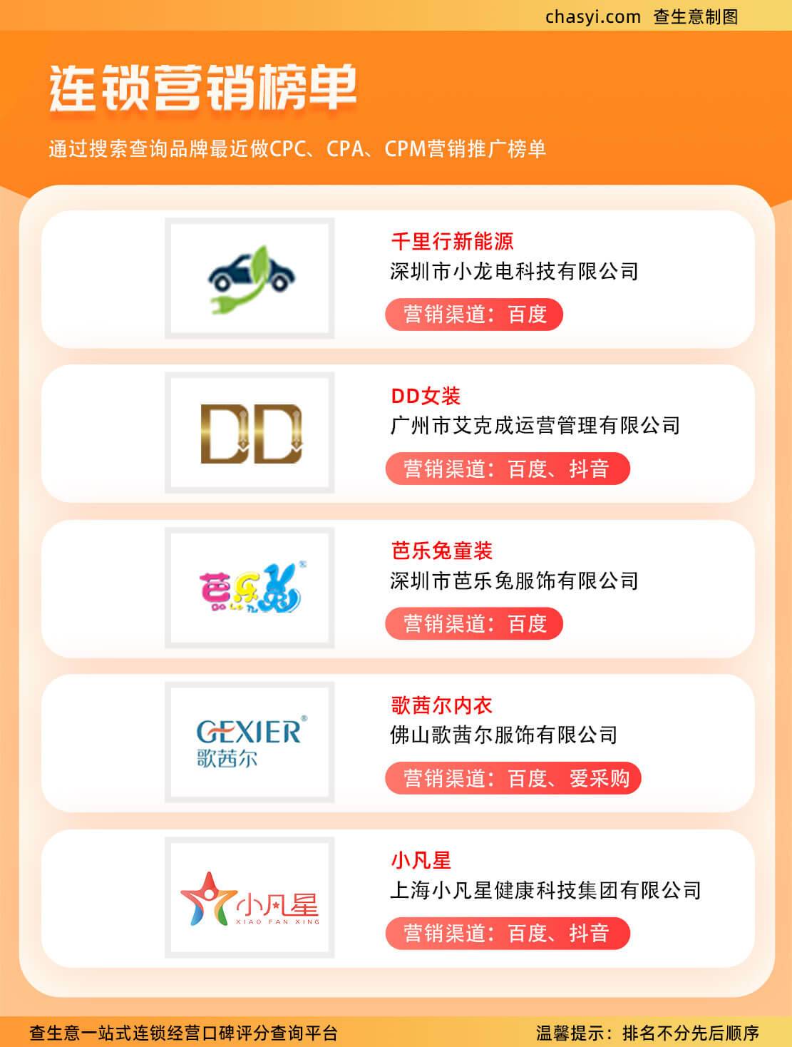 随着互联网的不断发展,品牌营销已经成为企业提升竞争力、扩大市场份额的重要手段。在最近的CPC(按点击付费)、CPA(按行动付费)、CPM(按千次展示付费)营销推广榜单中,千里行新能源、DD女装、芭乐兔童装、歌茜尔内衣以及小凡星等五个品牌凭借出色的营销策略和渠道选择,脱颖而出,成为行业的佼佼者。