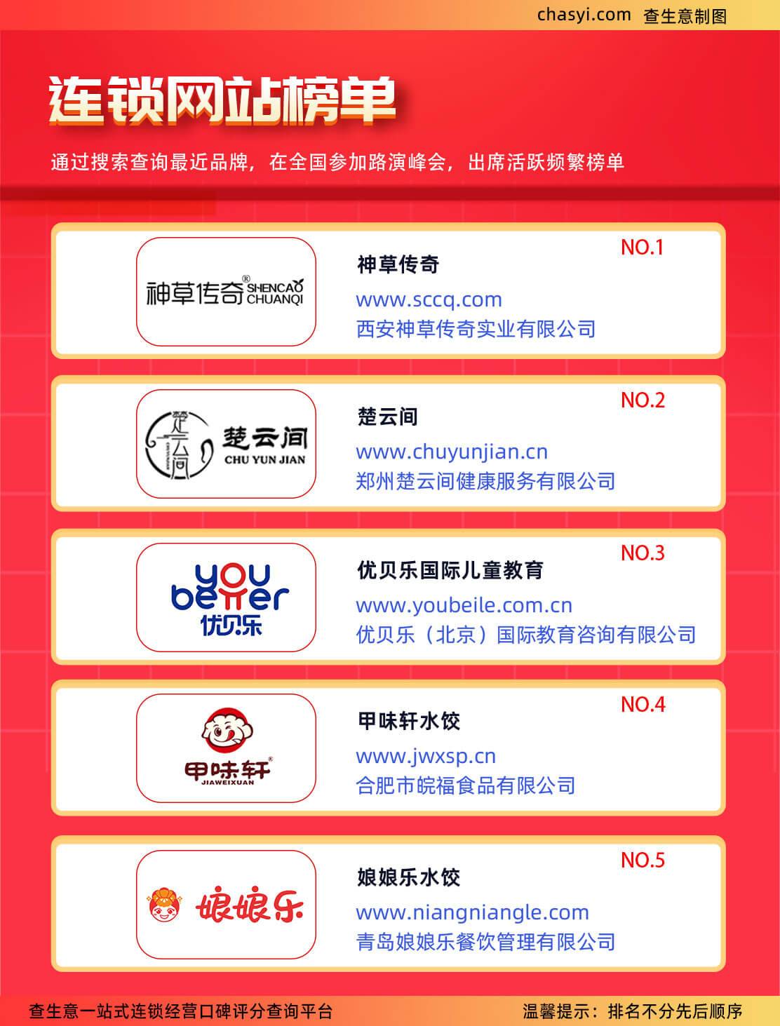 一份备受瞩目的连锁品牌网站榜单火热出炉,吸引了众多消费者和投资者的目光。在这份榜单中,西安神草传奇实业有限公司、郑州楚云间健康服务有限公司、优贝乐(北京)国际教育咨询有限公司、合肥市皖福食品有限公司以及青岛娘娘乐餐饮管理有限公司等五大品牌凭借其卓越的表现和独特的魅力,成功跻身前列,成为行业的佼佼者。