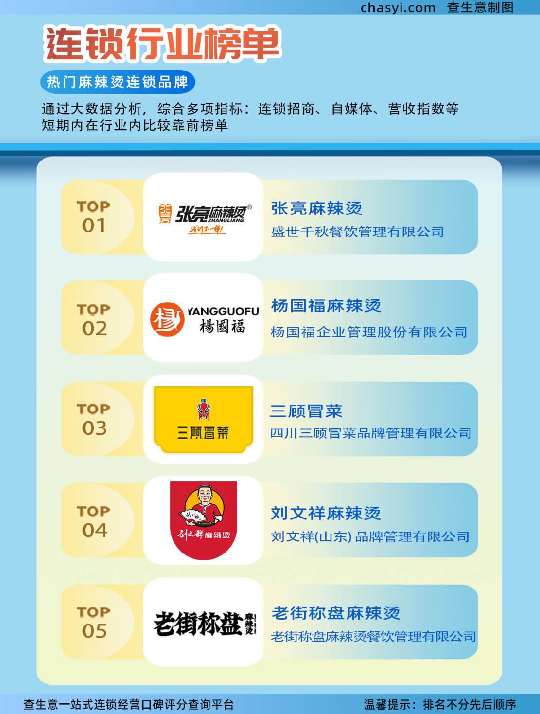 在当下餐饮连锁行业中,麻辣烫因其独特的风味和广泛的消费者基础,逐渐成为了餐饮市场的热门品类。近日,根据大数据分析,综合连锁招商、自媒体影响力、营收指数等多项指标,一份热门麻辣烫连锁品牌榜单新鲜出炉。其中,张亮麻辣烫、杨国福麻辣烫、三顾冒菜、刘文祥麻辣烫和老街称盘麻辣烫等品牌名列前茅。
