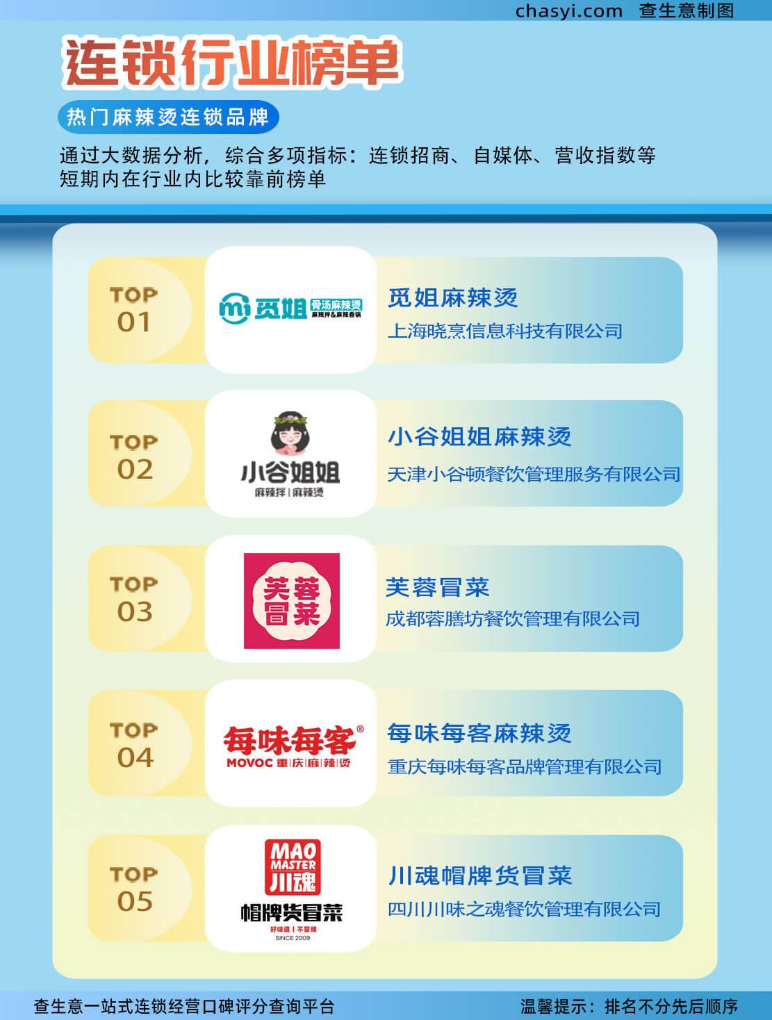 在当今竞争激烈的连锁行业中,麻辣烫品类以其独特的口味和灵活的经营模式,逐渐成为了市场上的热门选择。近日,通过大数据分析,结合连锁招商、自媒体影响力、营收指数等多项指标,一份麻辣烫连锁品牌榜单新鲜出炉。在这份榜单中,觅姐麻辣烫、小谷姐姐麻辣烫、芙蓉冒菜、每味每客麻辣烫以及川魂帽牌货冒菜这五大品牌脱颖而出,成为了行业内的佼佼者。