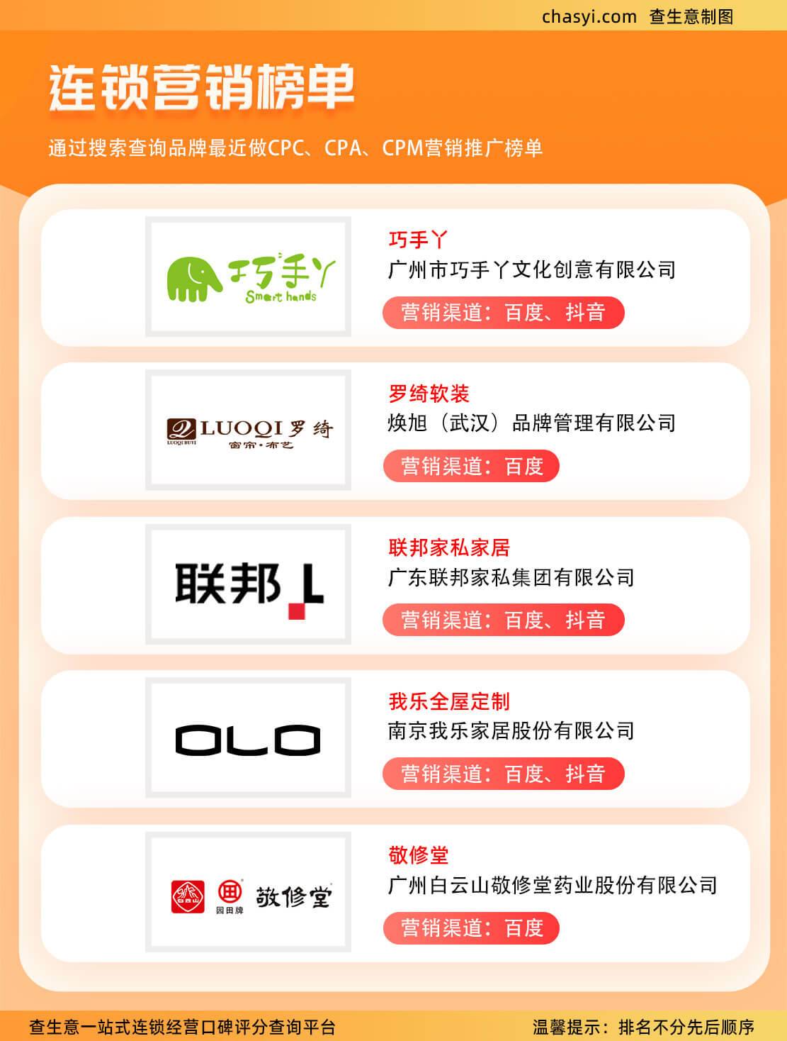 随着互联网技术和数字营销手段的快速发展,众多连锁品牌正在积极布局线上线下整合营销策略,借助搜索引擎广告和短视频社交平台的力量,实现品牌曝光度和市场影响力的快速提升。近期,在各大营销平台上崭露头角的五家企业——巧手丫、罗绮软装焕旭、联邦家私家居、我乐全屋定制以及百年老字号敬修堂,通过精准高效的CPC、CPA、CPM等营销模式,在百度和抖音平台上创造了不俗的业绩,成为连锁营销榜单上的焦点。
