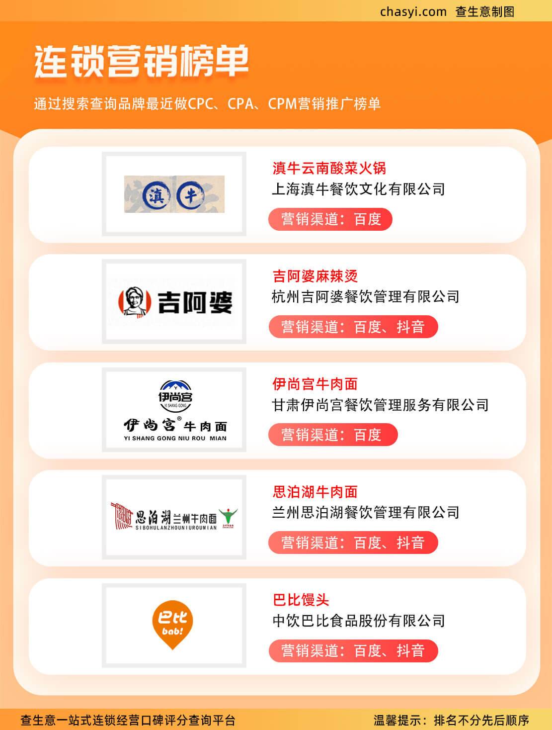 在当今竞争激烈的餐饮市场中,连锁品牌如何巧妙运用数字营销工具,精准触达目标消费者,实现品牌曝光与销售转化,已成为决定其市场地位的关键因素。聚焦近期活跃于百度与抖音双平台,采用CPC(按点击付费)、CPA(按行动付费)、CPM(每千次展示付费)模式进行营销推广的五家连锁餐饮品牌——滇牛云南酸菜火锅、吉阿婆麻辣烫、伊尚宫牛肉面、思泊湖牛肉面以及巴比馒头,我们得以窥见其在网络营销领域的创新实践与卓越成效。