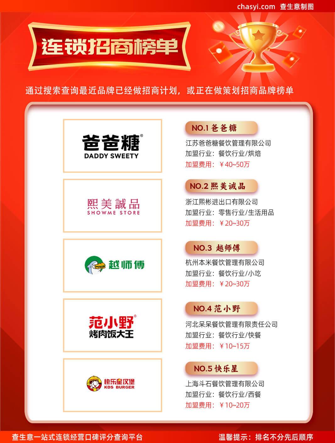 随着市场环境的持续演变与消费者需求的多元化,连锁加盟以其成熟的品牌效应、标准化运营体系及全方位支持服务,成为众多创业者实现创业梦想的优选路径。近期,一批颇具实力与潜力的连锁品牌崭露头角,凭借其独特的商业模式、稳健的市场表现及合理的加盟费用,荣登连锁招商榜单。本文将聚焦其中五位佼佼者——爸爸糖、熙美诚品、越师傅、范小野和快乐星,解析其品牌特色、加盟优势以及市场前景,为投资者提供一份详实的投资参考。