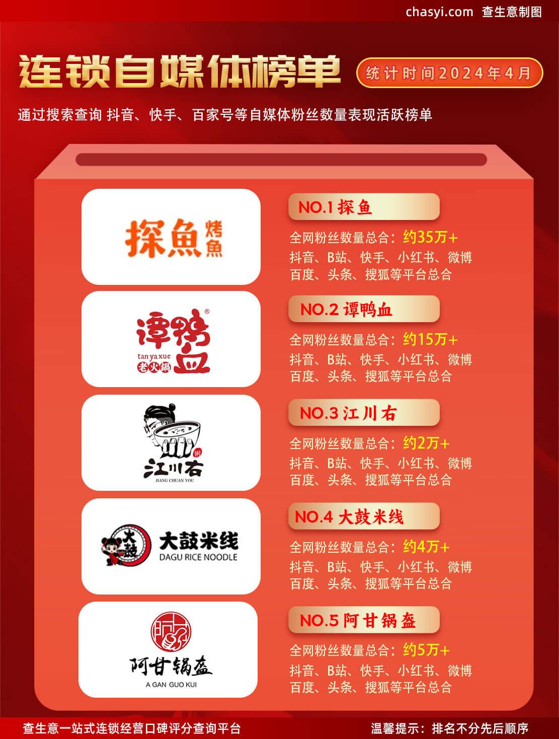 随着数字化营销的深入发展,自媒体平台已成为众多连锁品牌构建品牌形象、增强用户粘性、扩大市场影响力的重要阵地。近期发布的“连锁自媒体榜单”(统计时间:2024年4月),对探鱼、谭鸭血、江川右、大鼓米线以及阿甘锅盔这五大餐饮品牌在抖音、快手、B站、小红书、微博、百度、头条及搜狐等主流社交与内容平台上的粉丝数量进行了详尽统计与分析。现就各品牌在自媒体矩阵中的表现进行解读。