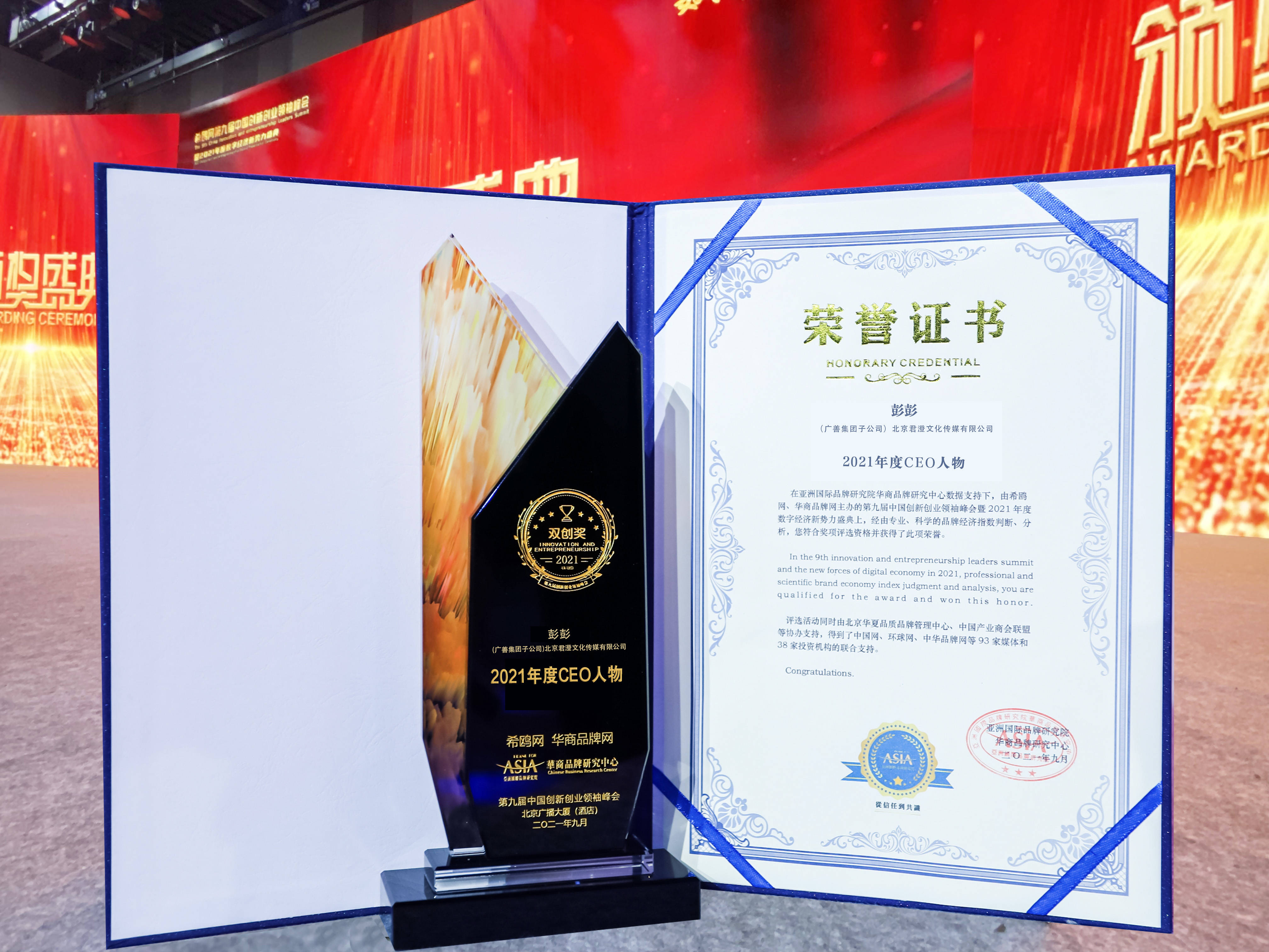 在活动的最后,第九届创新创业领袖峰会年度数字经济新势力品牌及其他系列奖项荣誉揭晓,凭借创新力及在行业内的影响力,彭彭(广善集团常务副总裁,君澄文化传媒CEO)获评2021年度CEO人物奖项。