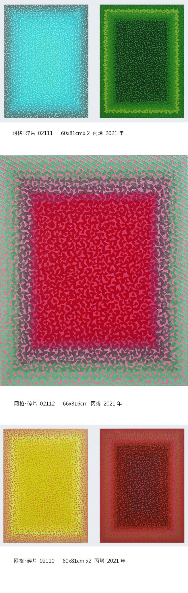 他说艺术的核心是一个能量的问题。万事万物都具有意识能量,任何的文字、图像也具有不同的意识能量,越本质的图像越具有高的意识能量。而整个艺术活动也是一种能量形式的传导。如同中国美学,把“气”的无形精神性,当作人与艺术的内在能量去领悟,并以此作为价值判断。因此表达“本质之物”成了他的创作意图。他以量子微观世界里的核心元素,如波粒,超弦、网、碎片等物质原型与时代图腾,这些具有很高意识能量的象征图像,应用在创作题材当中,并尝试找到一种新的绘画形式和绘画语言,创造出一种新的视觉经验的可能性。