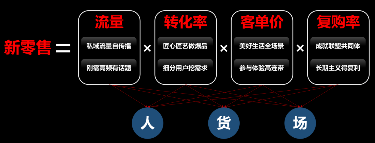 如今随着互联网的发展以及技术的更新,在零售行业里,会运用到数据与算法,从人、场、货进行数据化,进行重构,精准分析。但万变不离其宗,剥开表象看本质。零售的本质就是流量、转化率、客单价、复购率这四个关键要素决定的。