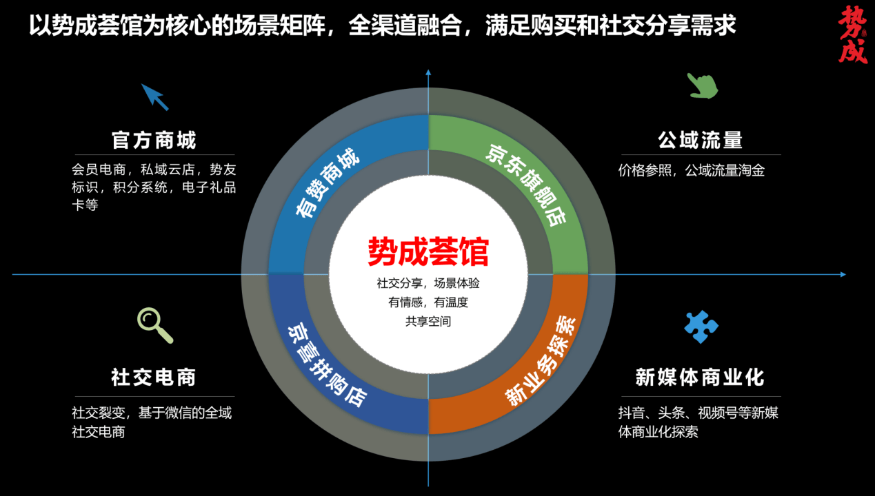 势成聚焦打造以“势成荟馆”为核心,可以满足社交分享、场景体验、具有情感温度、可以私域流量转化的线上线下融合的销售渠道体系。