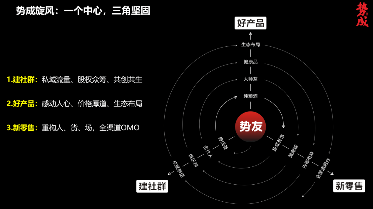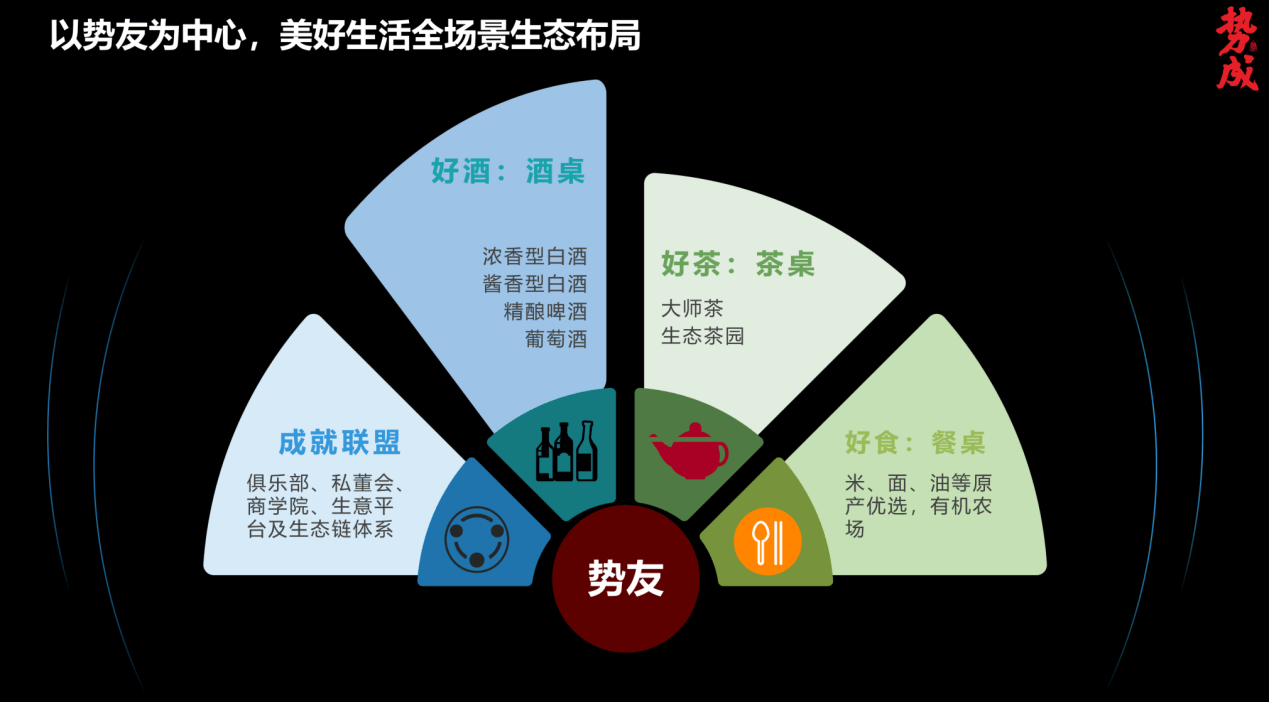 势成是以势友为中心,一切战略方向围绕势友,着眼于势友的终身价值。势成在“货”上面的布局规划是以白酒为载体,布局美好生活全场景。