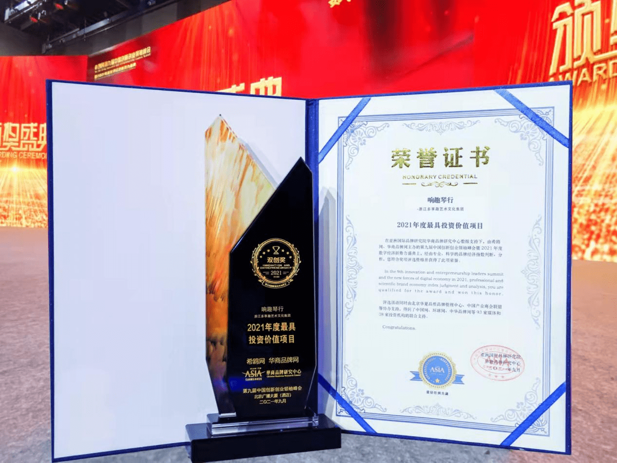 在活动的最后,第九届创新创业领袖峰会年度数字经济新势力品牌及其他系列奖项荣誉揭晓,凭借创新力及在行业内的影响力,浙江多享趣艺术文化集团获评2021年最具价值投资奖项。