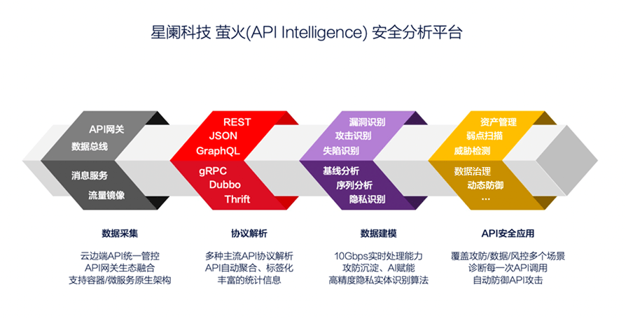 在现代IT应用架构中,API通信如“血液”般承载了绝大多数的应用数据交换,为解决API安全问题,公司从攻防能力、大数据分析能力及云原生技术体系出发,提供全景化API识别、API高级威胁检测、API调用行为分析等能力,构建API Runtime Protection体系。星阑科技产品——萤火 (API Intelligence) 拥有不同应用场景的解决方案,适配服务器、容器集群、微服务架构以及云平台等多种架构。通过API资产梳理、漏洞管理、威胁监测、运营与响应能力,解决企业API漏洞入侵、数据泄露两大核心风险。