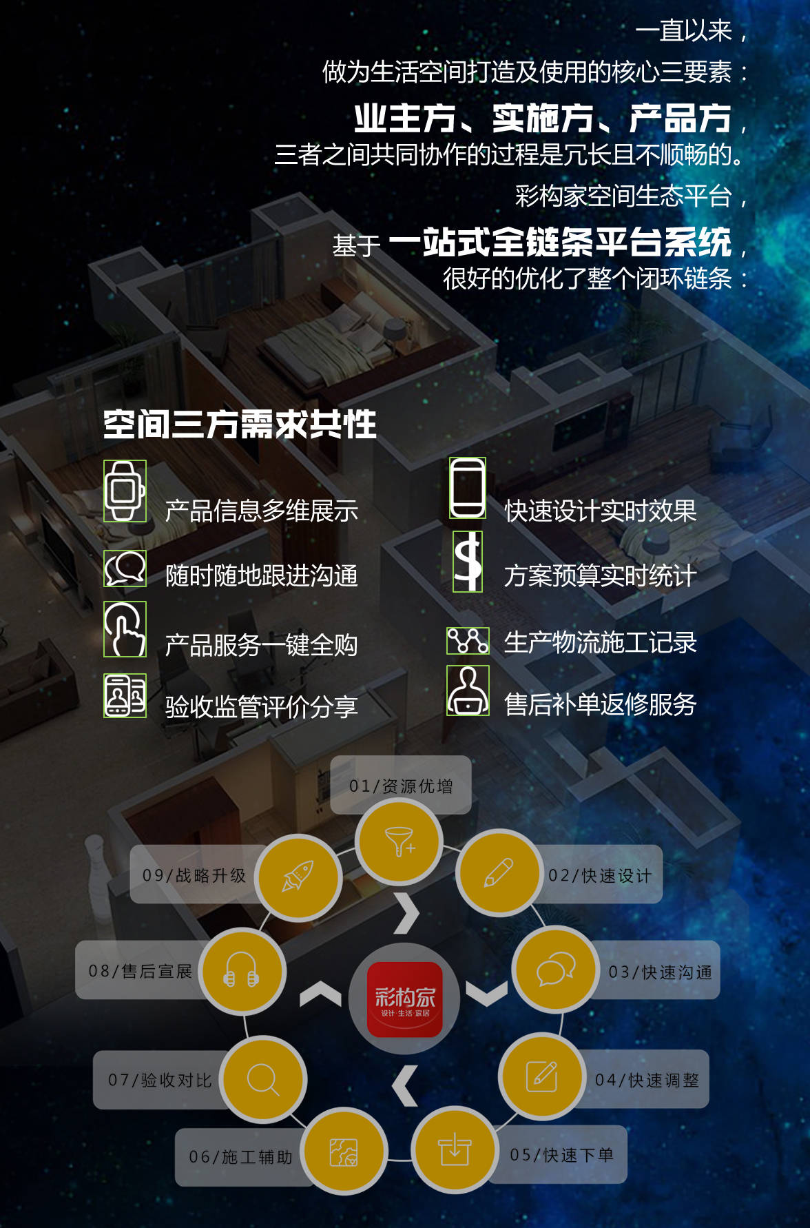 “关于空间这里面我也不做太多赘诉,因为空间的概念是非常广义的,我们现实生活当中的各种空间,都是属于空间真实世界和虚拟世界,无论我们未来、在虚拟的元宇宙空间里面从事什么样的活动,无论是娱乐、生活还是工作,还是在现实生活当中去打造我们现在当下的这个生活和工作的空间,彩构家都能很好的提供这样的一个平台和载体。”