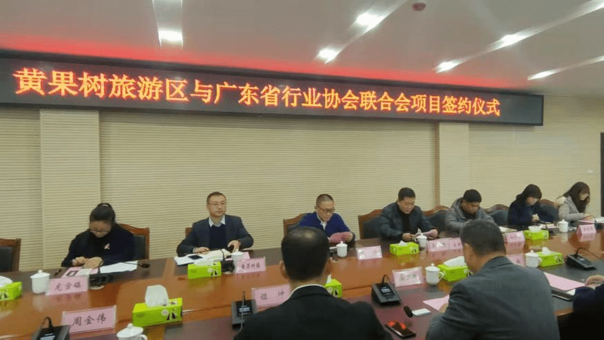 11月22日上午,黄果树旅游区管理委员会与广东省行业协会联合会在管委会五楼第一会议室举行黄果树华商环球人才老百姓就业服务项目签约仪式。会议由党工委委员、龙宫风景名胜区管理处处长王强主持,党工委书记张悦同志出席,黄果树镇、白水镇、龙宫镇、区投资促进局、社保局、乡村振兴办等单位相关负责同志参加会议。