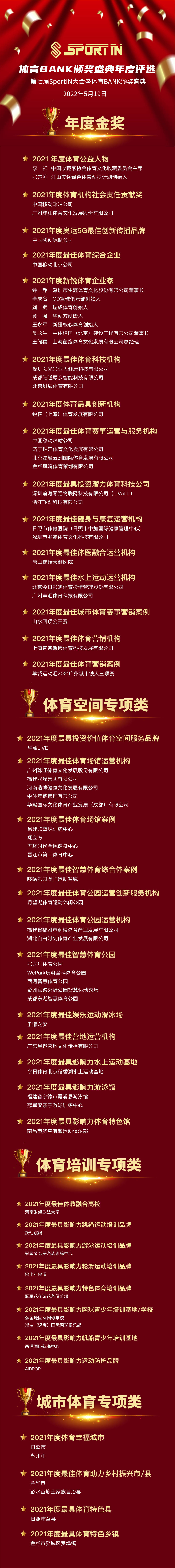 第七届SportIN大会暨体育BANK颁奖获奖全名单年度金奖:2021 年度体育公益人物中国收藏家协会体育文化收藏委员会主席李祥、 江山美途绿色体育帮扶计划创始人张楚乔、 2021年度体育机构社会责任贡献奖中国移动咪咕公司、 广州珠江体育文化发展股份有限公司、 2021年度奥运、 G最佳创新传播品牌中国移动咪咕公司、 2021年度体育最佳体育综合企业中国移动北京公司、 2021年度新锐体育企业家深圳市生涯体育文化股份有限公司董事长钟乔、 OD篮球俱乐部创始人李成名、 瑞成体育董事长刘斌 、华动方创始人黄强、 新疆核心体育创始人王永军 中体建国(北京)、建设工程有限公司董事长吴永生、 上海茵跑体育文化发展有限公司总经理王闻稷、 2021年度最佳体育科技机构深圳阳光兴亚大健康科技有限公司、 成都陆道原乡智能科技有限公司、 北京维辰体育有限公司、 2021年度体育最具创新机构锐客(上海)体育发展有限公司、 2021年度最佳体育赛事运营与服务机构中国移动咪咕公司、 济宁珠江体育文化发展有限公司 、北京星耀五洲国际体育发展有限公司 、金华凤鸣体育策划有限公司、 2021年度最具投资潜力体育科技公司深圳前海零距物联网科技有限公司(LIVALL) 浙江飞剑科技有限公司、 2021年度最佳健身与康复运营机构日照市体育医院(日照市中加国际健康管理中心) 深圳市鹏翰体育文化科技有限公司、 2021年度最佳体医融合运营机构唐山慈瑞天健医院 、2021年度最佳水上运动运营机构北京今日影响体育投资管理股份有限公司 、广州丰汇体育科技有限公司、 2021年度最佳城市体育赛事营销案例山水四项公开赛 、2021年度最佳体育营销机构上海普普斯博体育科技发展有限公司、 2021年度最佳体育营销案例羊城运动汇、2021广州城市铁人三项赛