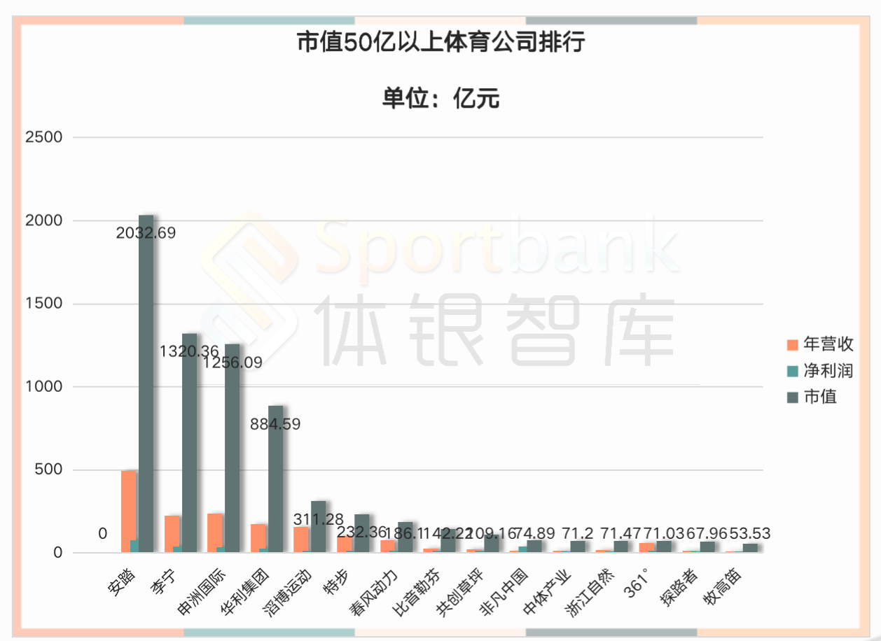 大会中,体银智库创始人安福秀博士现场发布《2022体育产业发展报告》、《2022体育公园实操及经典案例报告》、《2022中国潮流体育发展报告》三大报告。《2022体育产业发展报告》通过对35家体育上市公司2021年财报营收统计分析,市值排名前十的品牌均为体育用品销售及制造企业,安踏以超2000亿的市值居于榜首,李宁、申洲国际市值也超1000亿,华利集团运动鞋营收超174亿,市值逼近千亿大关。滔博运动、特步、春风动力、共创草坪等企业市值为百亿级,非凡中国、浙江自然、361°、牧高笛、探路者市值在50亿元之上。值得注意的是,市值50亿之上的企业营收和净利润都实现正增长,营收除中体产业、滔博运动小幅下降,其他均为增长值,其中李宁、非凡中国、疯狂体育、春风动力营收增幅超过50%。