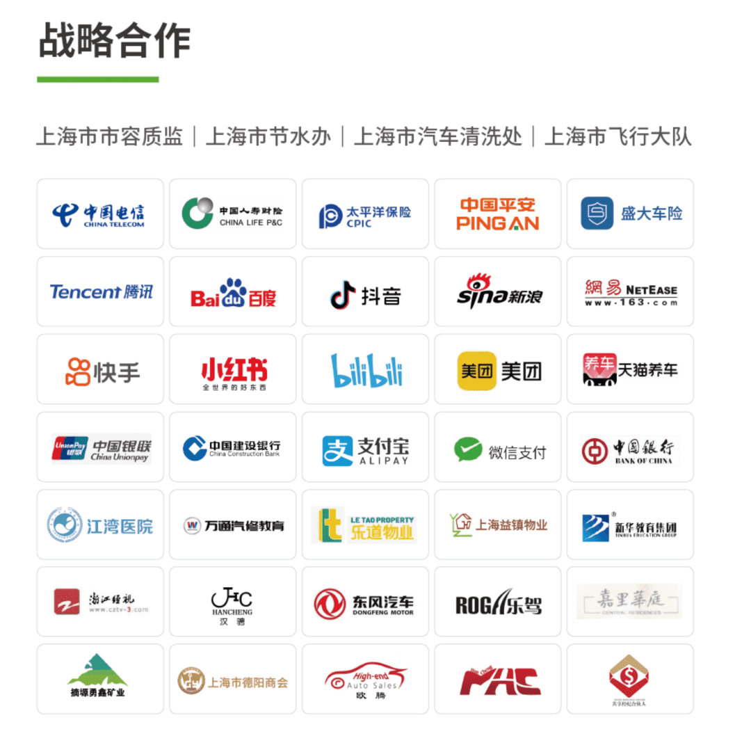 上海市市容质监、上海市节水办、上海市汽车清洗处、中国平安保险、太平洋保险、中国国寿财产保险、中国电信、 中国建设银行、保利、万科、中信国安社区、央视CCTV、盛大车险、江湾医院、 vva 益镇物业、乐道物业、嘉里华庭、万通汽车教育、新华教育、腾讯、微信、银联等等。均是国企央企政务单位,及知名企业进行合作。