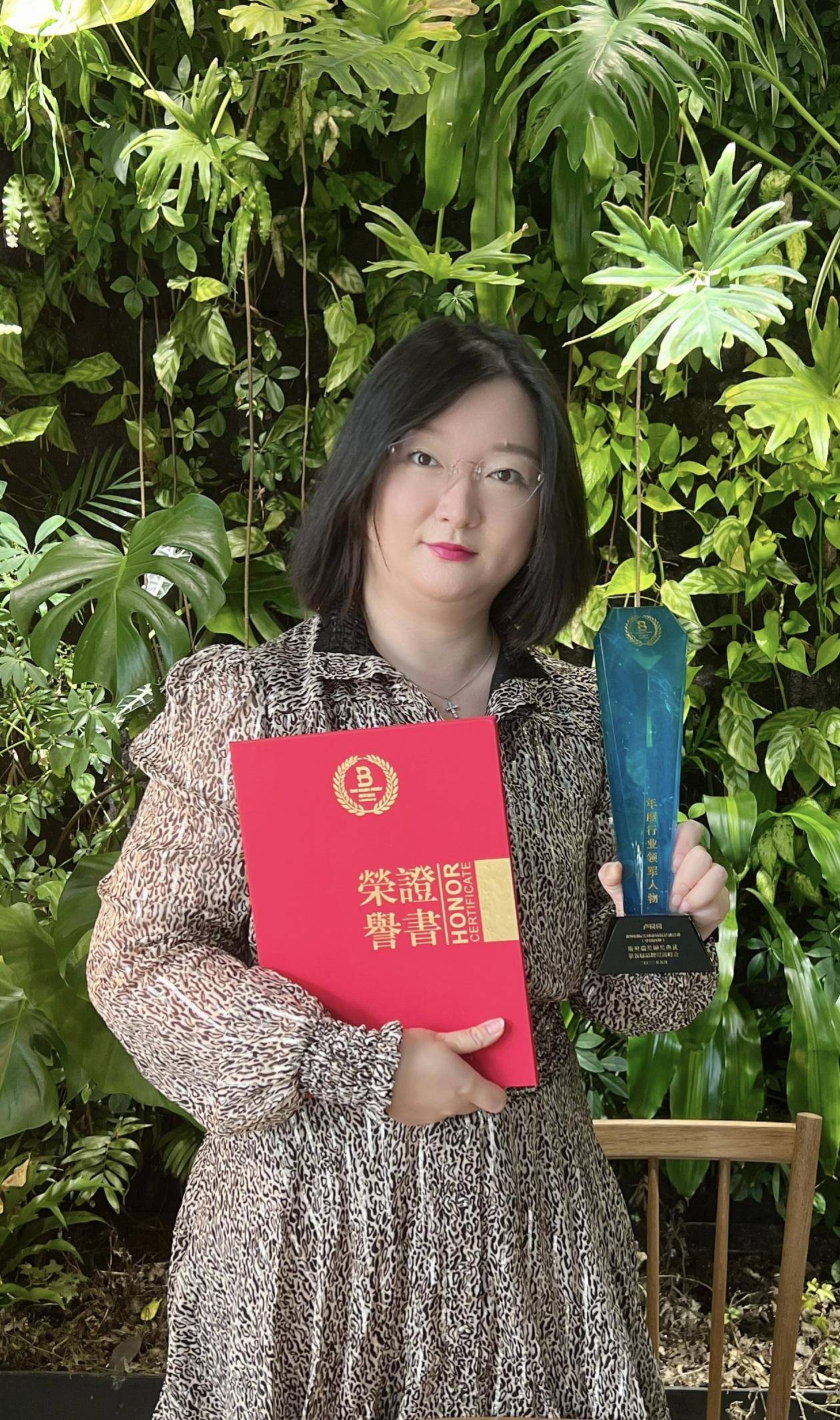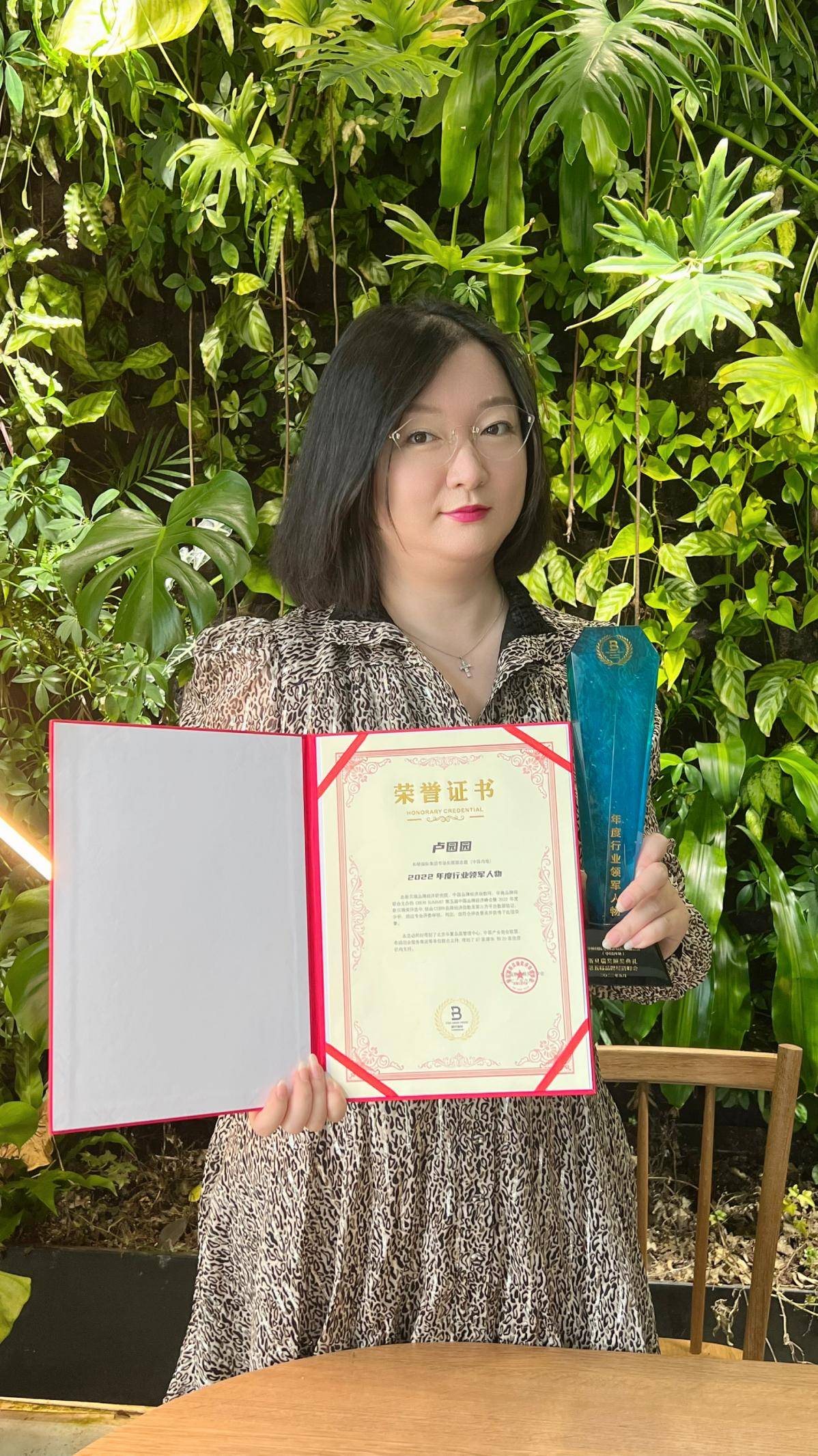 本次活动,因为受到上海疫情的影响,Salina Lu(卢园园)女士无法亲临现场领奖,为此主办方特别将获奖证书及奖杯寄去上海,以恭贺其获得此殊荣。我们再次感谢Salina在2022年的杰出表现,并期待她未来更上一层楼!