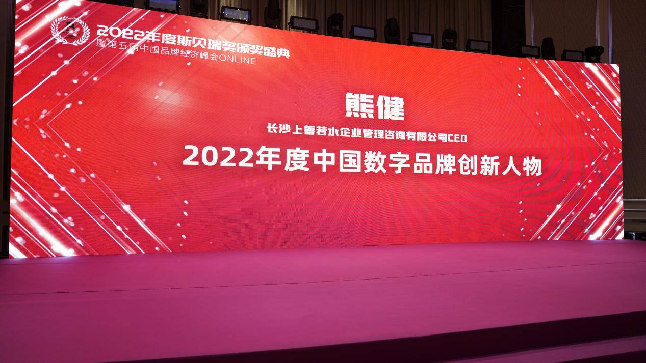 在下午的活动上,主持人宣布长沙上善若水企业管理咨询有限公司CEO熊健获评2022年度中国数字品牌创新人物奖项。