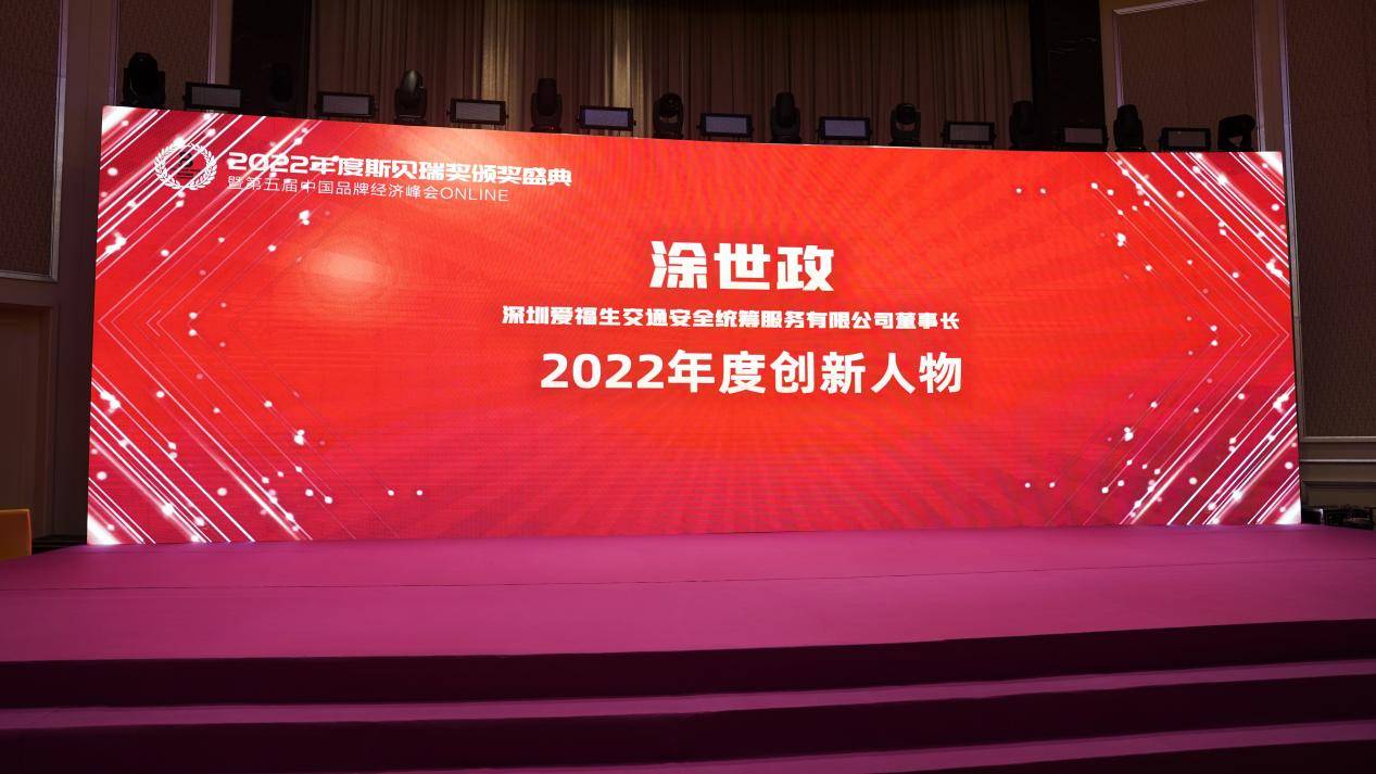 在下午的活动上,主持人宣布深圳爱福生交通安全统筹服务有限公司董事长涂世政获评斯贝瑞奖“2022年度创新人物”。