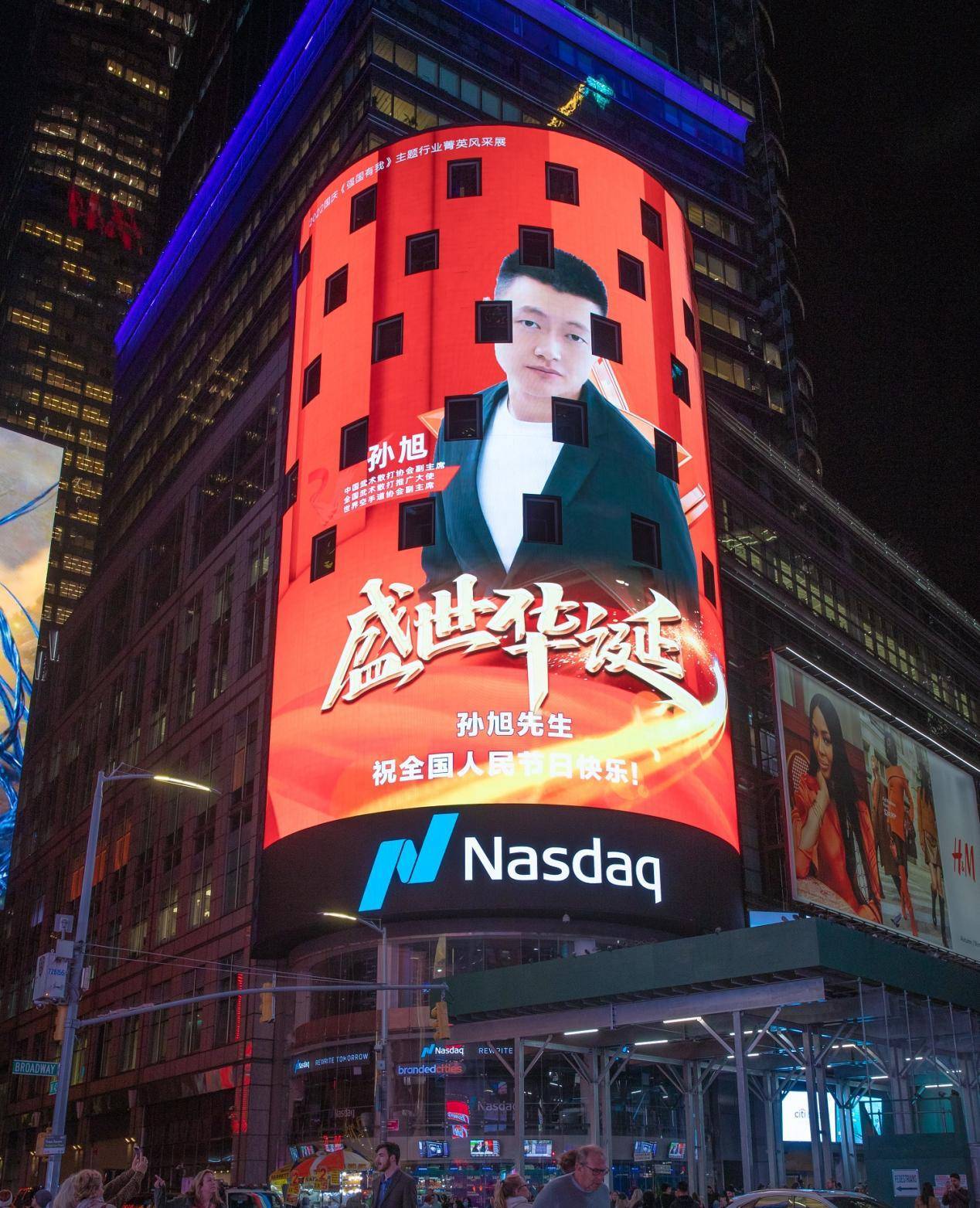 美国当地时间2022年10月1日,孙旭先生的巨幅宣传照片登陆这一被看做财富实力和发展潜力象征的纳斯达克大屏幕。