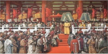 (图一:盛唐时期“万国来潮”的场景。图二:明朝资本主义萌芽时期的生产车间)